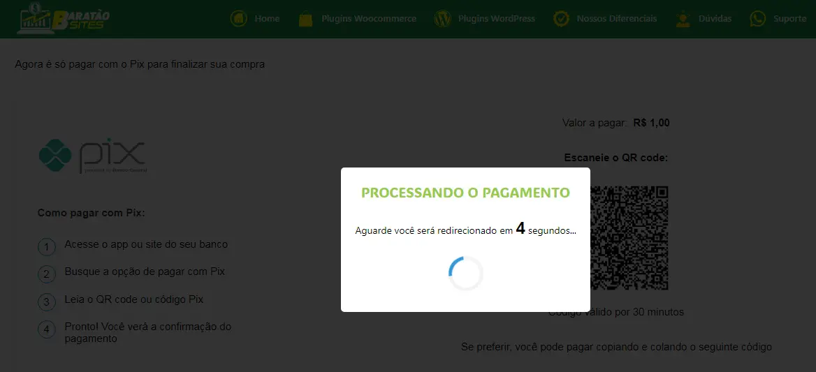 Com esse plugin de redirecionamento, assim que o pagamento cai, ele avisa o cliente: “Recebemos seu pagamento! Em 5 segundos você será redirecionado para o seu produto”. E pronto, ele redireciona o cliente direto no link que você escolher. É o jeito mais simples de dar o acesso para quem acabou de comprar, sem você precisar mover um dedo.